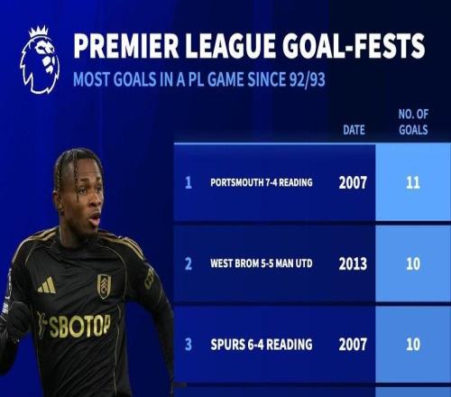 英超历史单场进球榜:富勒姆45曼城位列第七,最多为11球