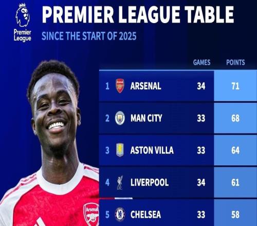 2025年英超积分排行:枪手71分居首,曼城68分第二,维拉第三
