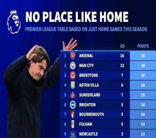 本赛季英超主场战绩榜:阿森纳19分居首,热刺5分倒数第二